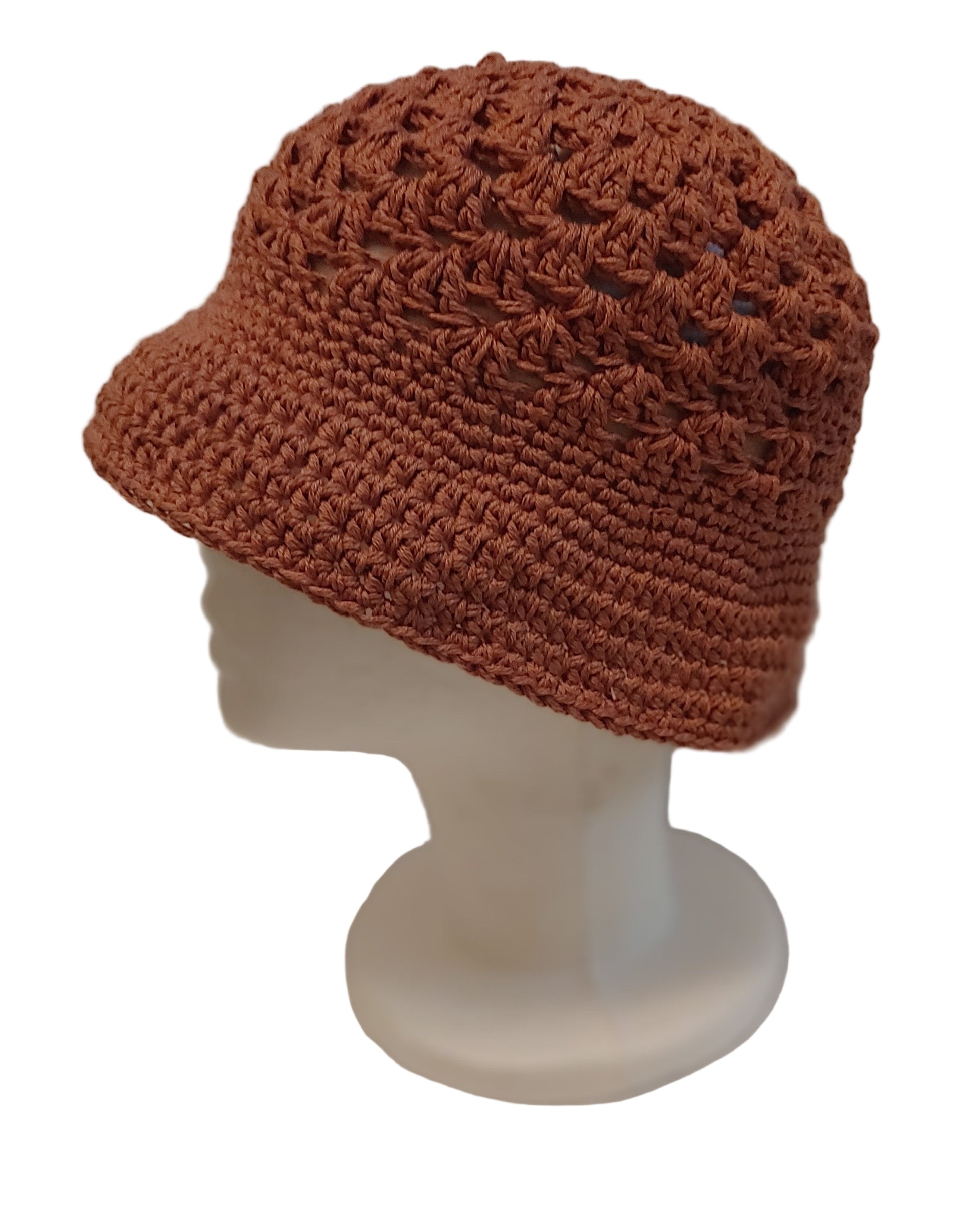 The Bronzy Brown Bucket hat is a comfy casual that can be dressed up or down. It can be worn with jeans for an ultra-casual look or it can be worn with dressed pants for an elegant slay. It is made of 50% cotton and 50% Bamboo yarn. This one of a kind bucket hat is the perfect fashion accessory for your summer fun in the sun days and great for your vacation.